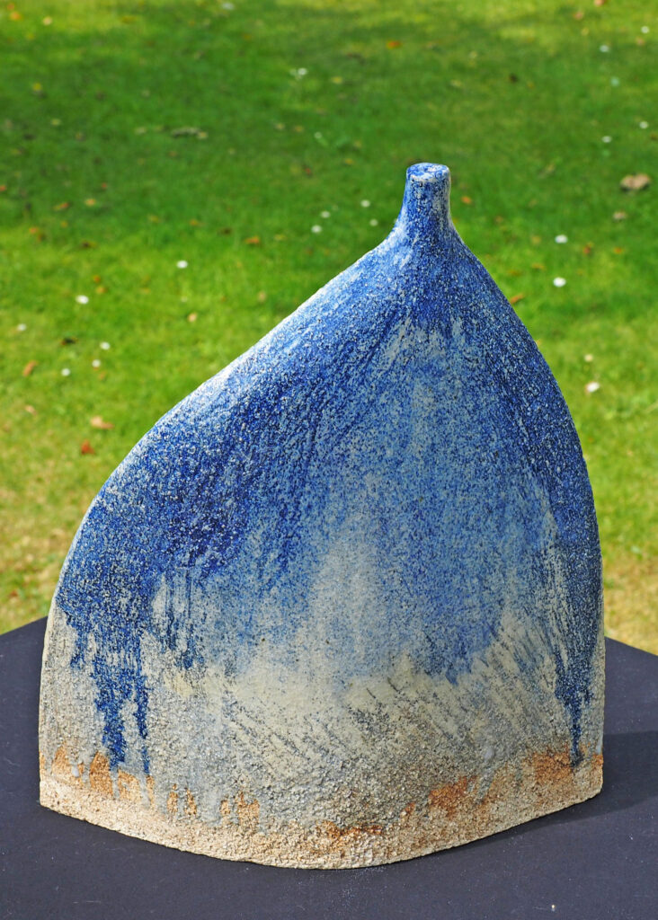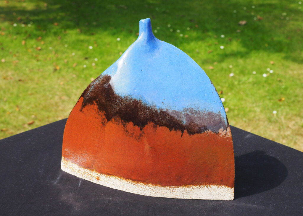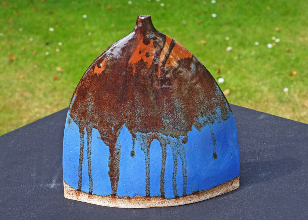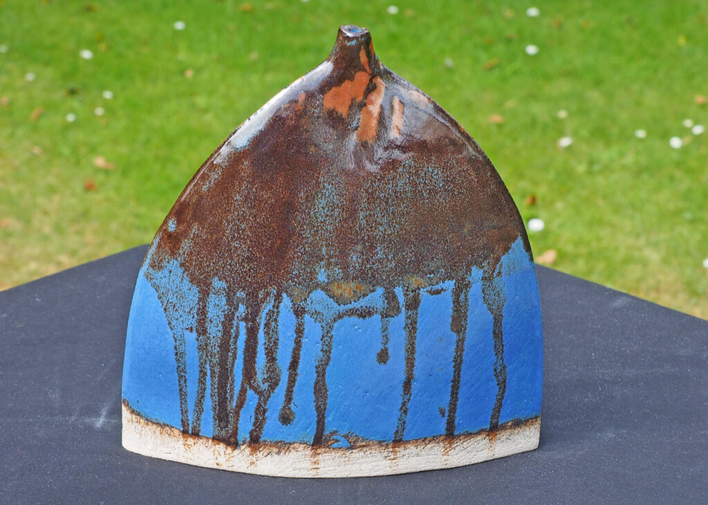 A small flagon glazed with a semi-matt blue and red-brown glaze.