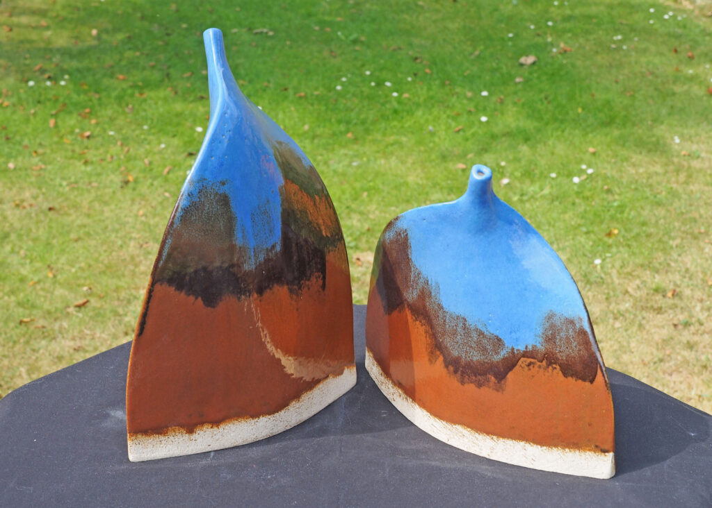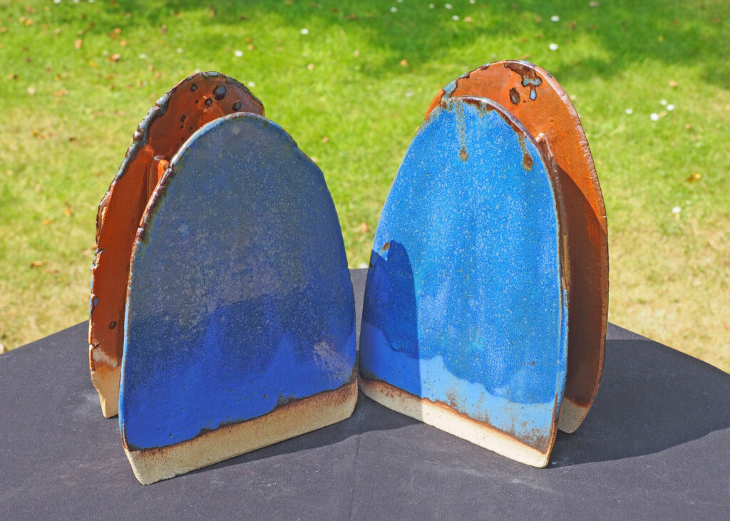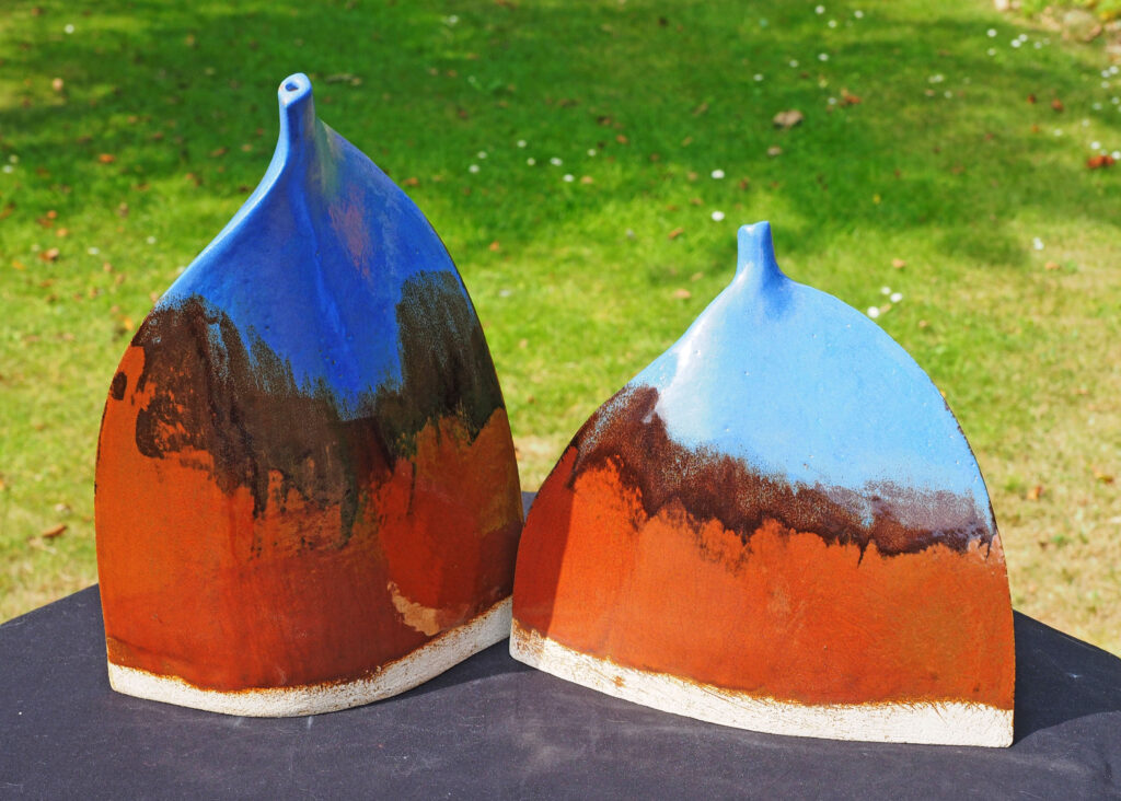 Two irregular sided slab pots with red-brown interiors and matt-blue and turquoise exteriors.